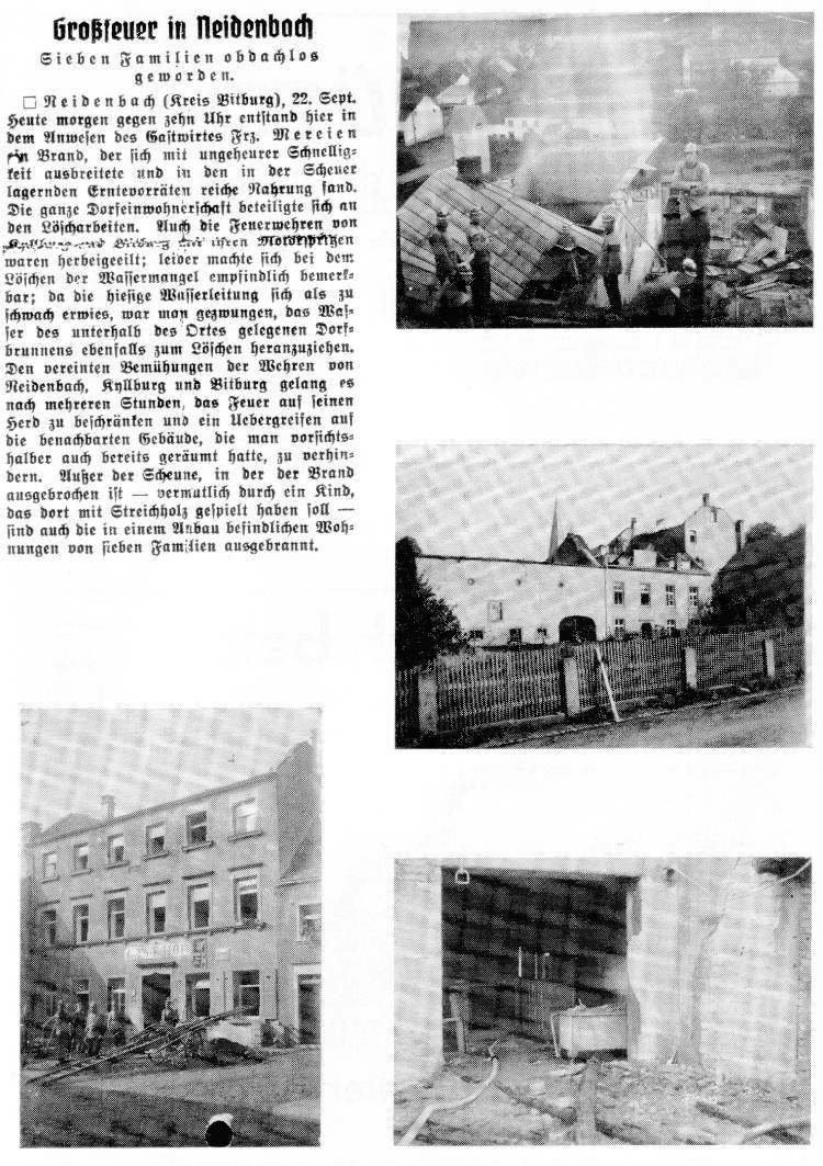 Unter dem 22. September 1936 ist zu lesen: "Heute brach im Anwesen des Gastwirtes Franz Mereien ein Brand aus, der in wenigen Minuten das ganze Anwesen einäscherte. Die obdachlosen Familien wurden in den freien Dienstwohnungen der Lehrerschaft unter- gebracht. Beim Brand zeigte sich wieder so recht die Unzulänglichkeit der hiesigen Wasserleitung."