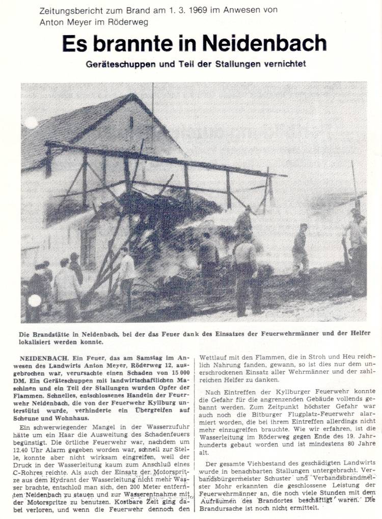Am 18.04.1969 rief die Sirene zum Brand in der Feldscheune von Wwe. Katharina Schmitz. Hierbei musste der angrenzende Neidenbach gestaut werden, damit eine schnelle Brandbekämpfung erfolgen konnte.