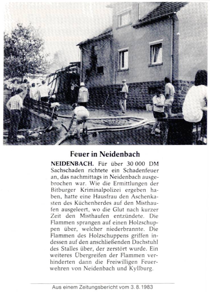 Am 30.07.1983 brach ein größeres Schadenfeuer im Anwesen von Matthias Grün in der Kyllburger Straße aus. Nähere Einzelheiten sind aus dem Zeitungsbericht vom 3.8.1983 zu entnehmen.